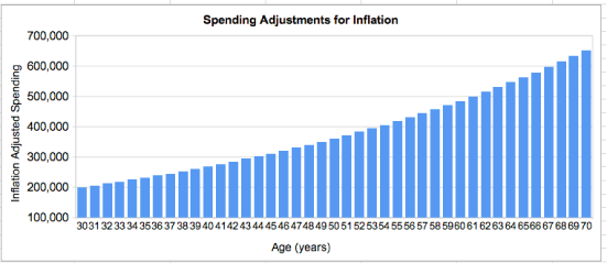 That’s not too crazy-conservative, is it? Heck, if you’re earning 5% on $4m, that’s $200k right there. No problem, right? You can coast forever with your fat nest egg largely untouched. You’re probably doing what I (and the AdGrok guys above) were doing: “Leaving aside inflation”. Let’s look at what you’ll have to spend to keep your $200k per year lifestyle with compounding annual inflation.