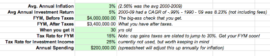 Of course, many of these numbers are strange. 4% for a money market? I’d love a link to that– the best I’ve been able to find is around 1.5% right now for a jumbo money market. Dying at 70? Chances are you’ll live to 90, at least. “Leaving aside inflation”? That’s disastrous (why would you leave aside a number that cuts your 4% by more than half?!). Let’s run through some REAL numbers, using my “Early Retirement Spreadsheet” (AKA “Fuck You Money Spreadsheet of DOOM” – feel free to save a copy and noodle with it).
